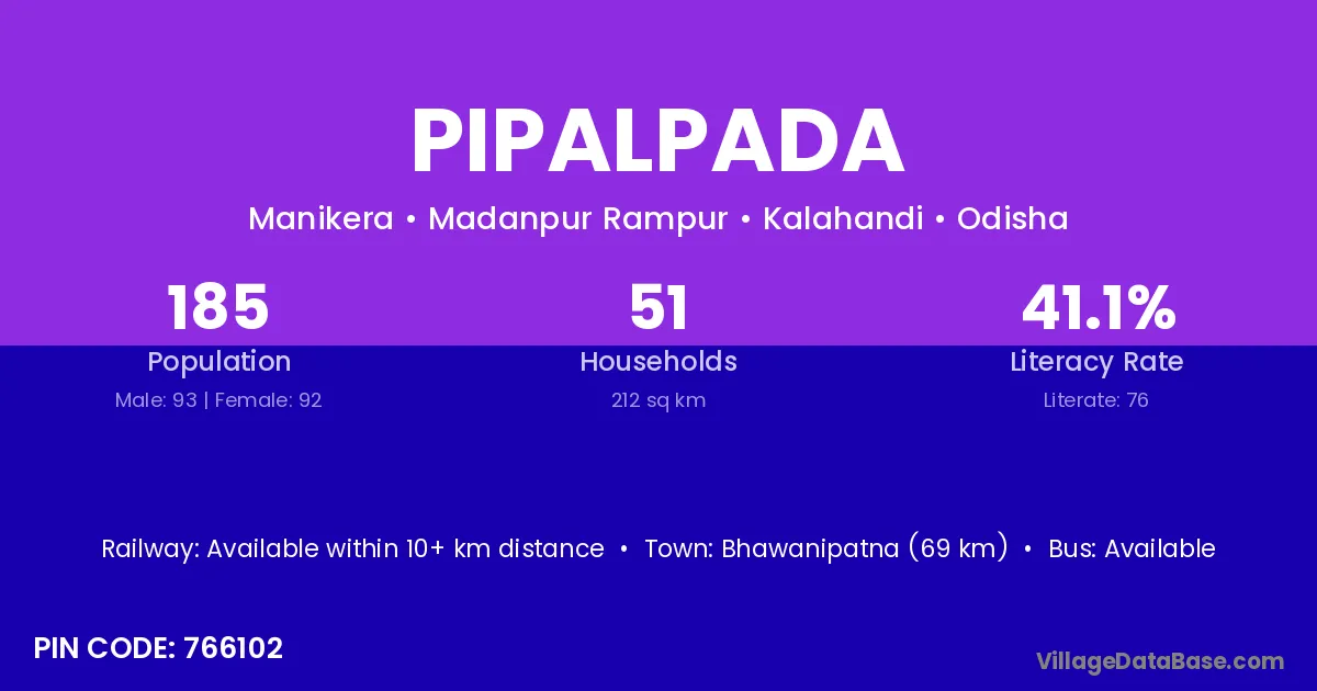 Madanpur Rampur (10 km) is the nearest town to Pipalpada village for major economic activities and is located approximately 10 km away.