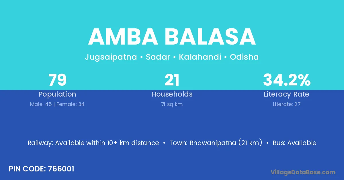 Bhawanipatna (21 km) is the nearest town to Amba Balasa village for major economic activities and is located approximately 21 km away.