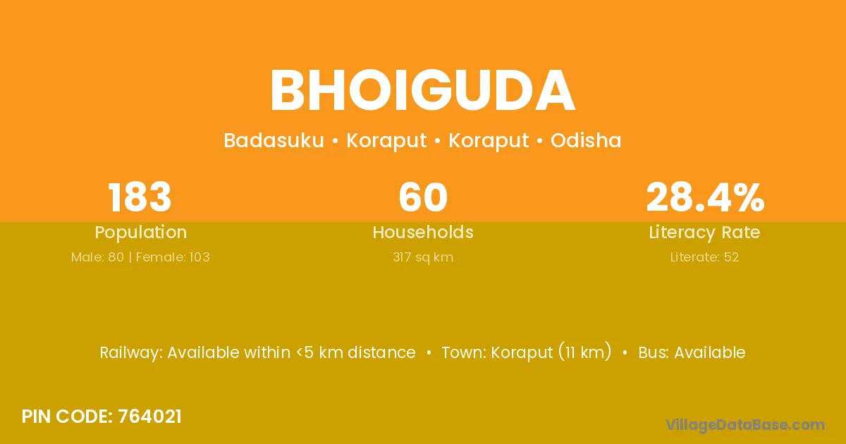Bhawanipatna (16 km) is the nearest town to Bhoiguda village for major economic activities and is located approximately 16 km away.