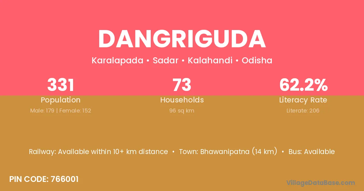 Bhawanipatna (14 km) is the nearest town to Dangriguda village for major economic activities and is located approximately 14 km away.
