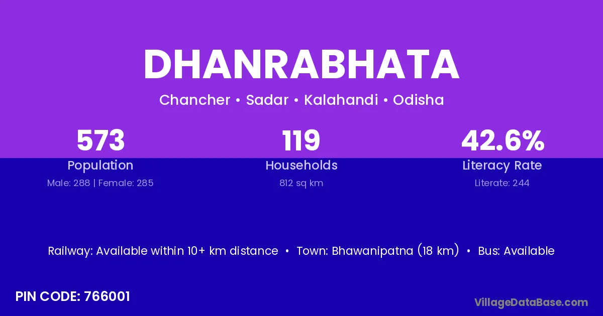Bhawanipatna (18 km) is the nearest town to Dhanrabhata village for major economic activities and is located approximately 18 km away.