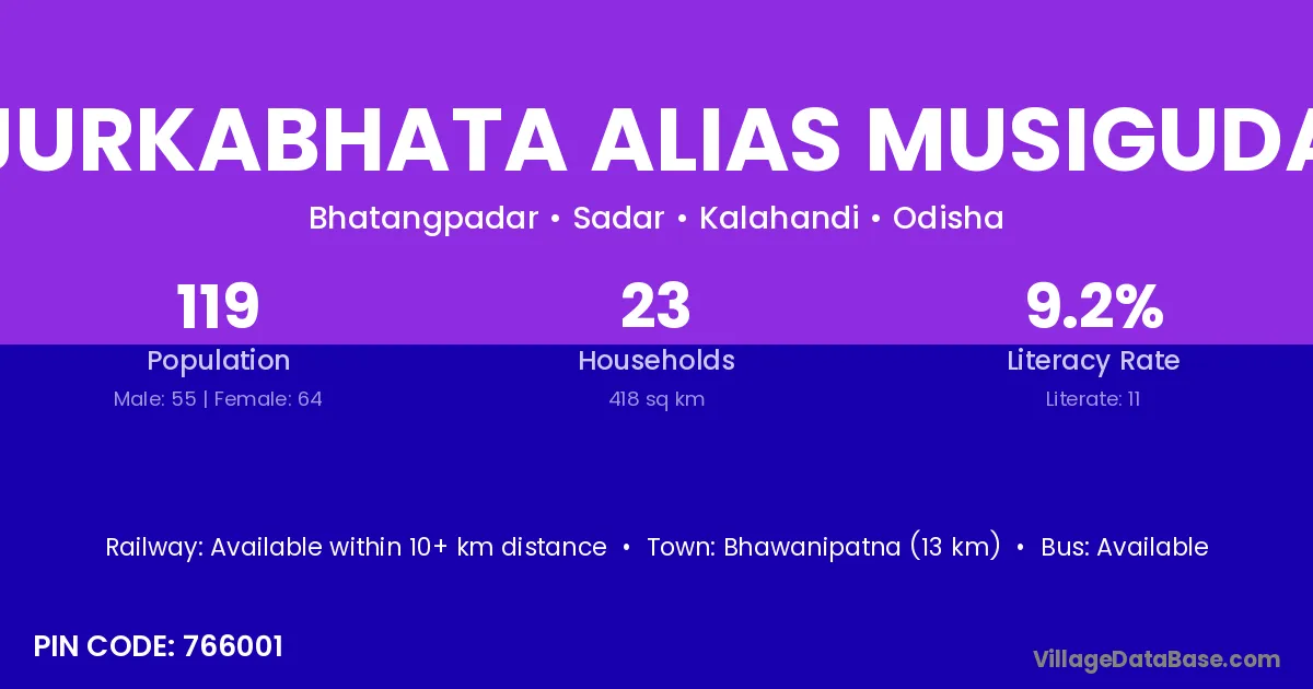 Bhawanipatna (13 km) is the nearest town to Jurkabhata Alias Musiguda village for major economic activities and is located approximately 13 km away.