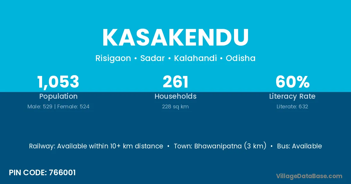 Bhawanipatna (3 km) is the nearest town to Kasakendu village for major economic activities and is located approximately 3 km away.