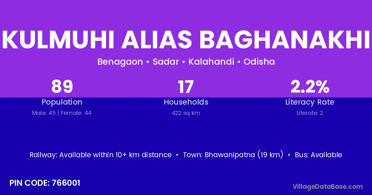 Kulmuhi Alias Baghanakhi village has a total population of 89 people, of which 45 are males and 44 are females.