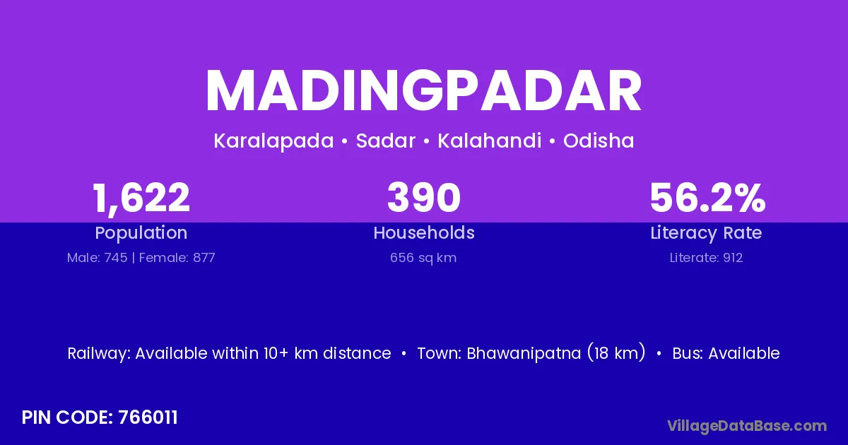 Bhawanipatna (18 km) is the nearest town to Madingpadar village for major economic activities and is located approximately 18 km away.
