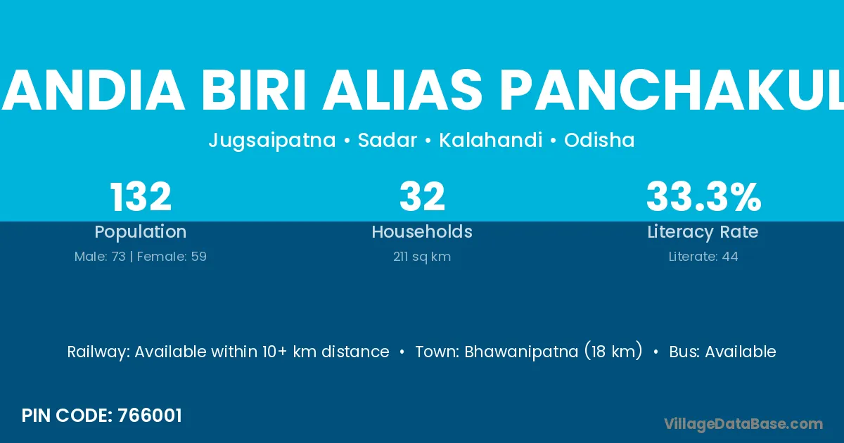 Bhawanipatna (18 km) is the nearest town to Mandia Biri Alias Panchakula village for major economic activities and is located approximately 18 km away.