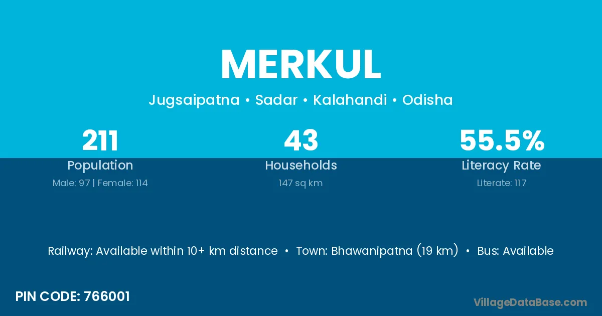 Bhawanipatna (19 km) is the nearest town to Merkul village for major economic activities and is located approximately 19 km away.