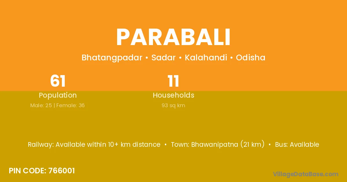 Bhawanipatna (21 km) is the nearest town to Parabali village for major economic activities and is located approximately 21 km away.