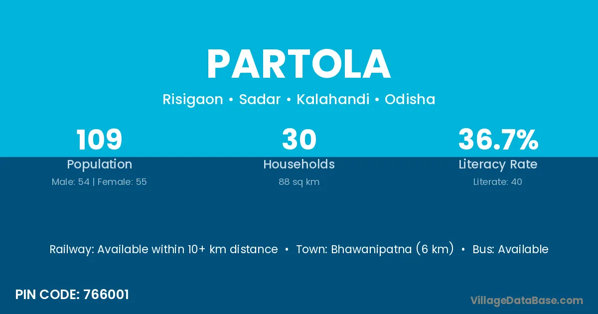 Bhawanipatna (6 km) is the nearest town to Partola village for major economic activities and is located approximately 6 km away.