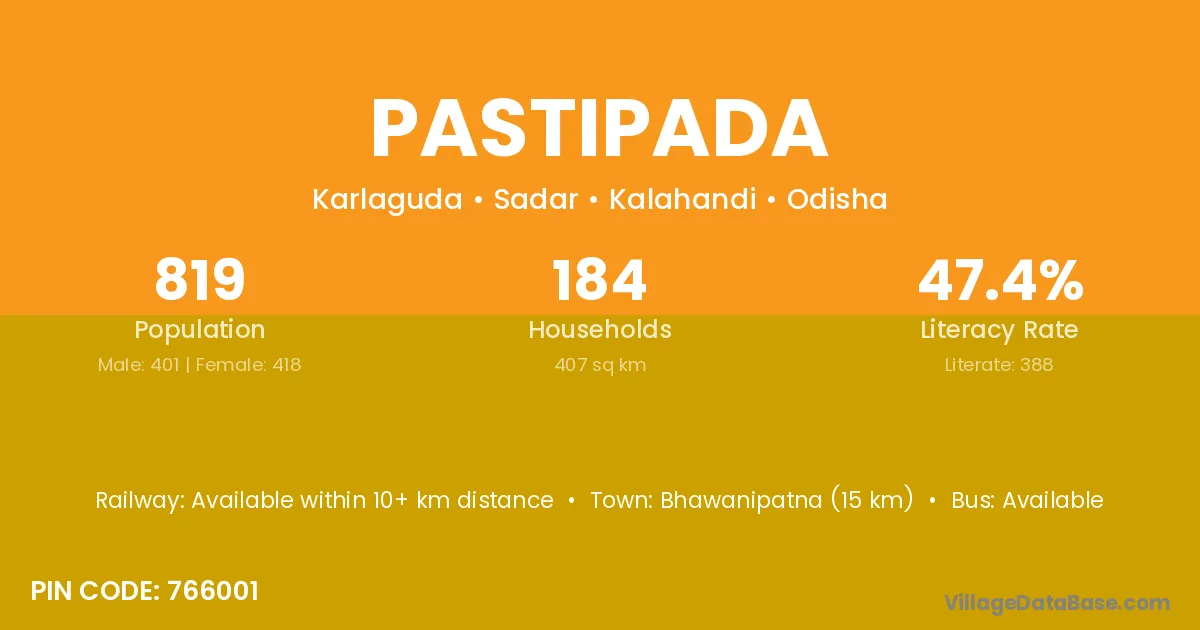 Bhawanipatna (15 km) is the nearest town to Pastipada village for major economic activities and is located approximately 15 km away.