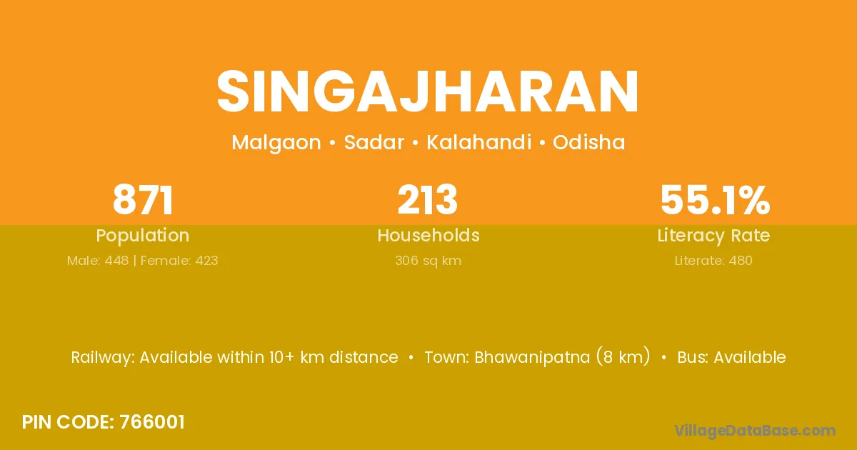 Bhawanipatna (8 km) is the nearest town to Singajharan village for major economic activities and is located approximately 8 km away.