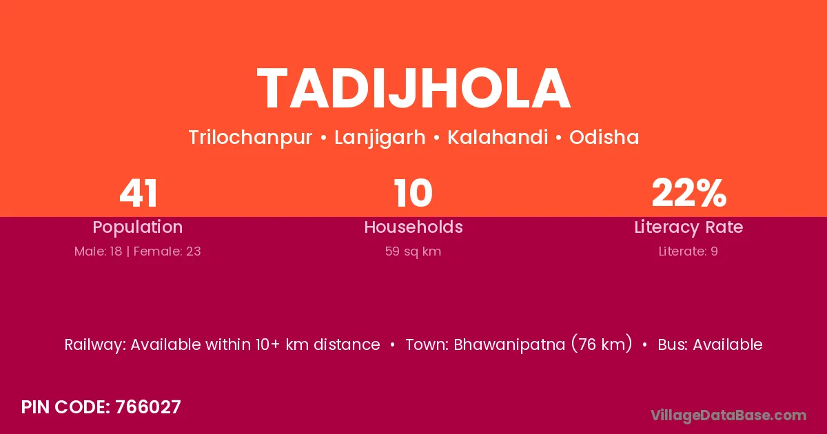 Bhawanipatna (24 km) is the nearest town to Tadijhola village for major economic activities and is located approximately 24 km away.