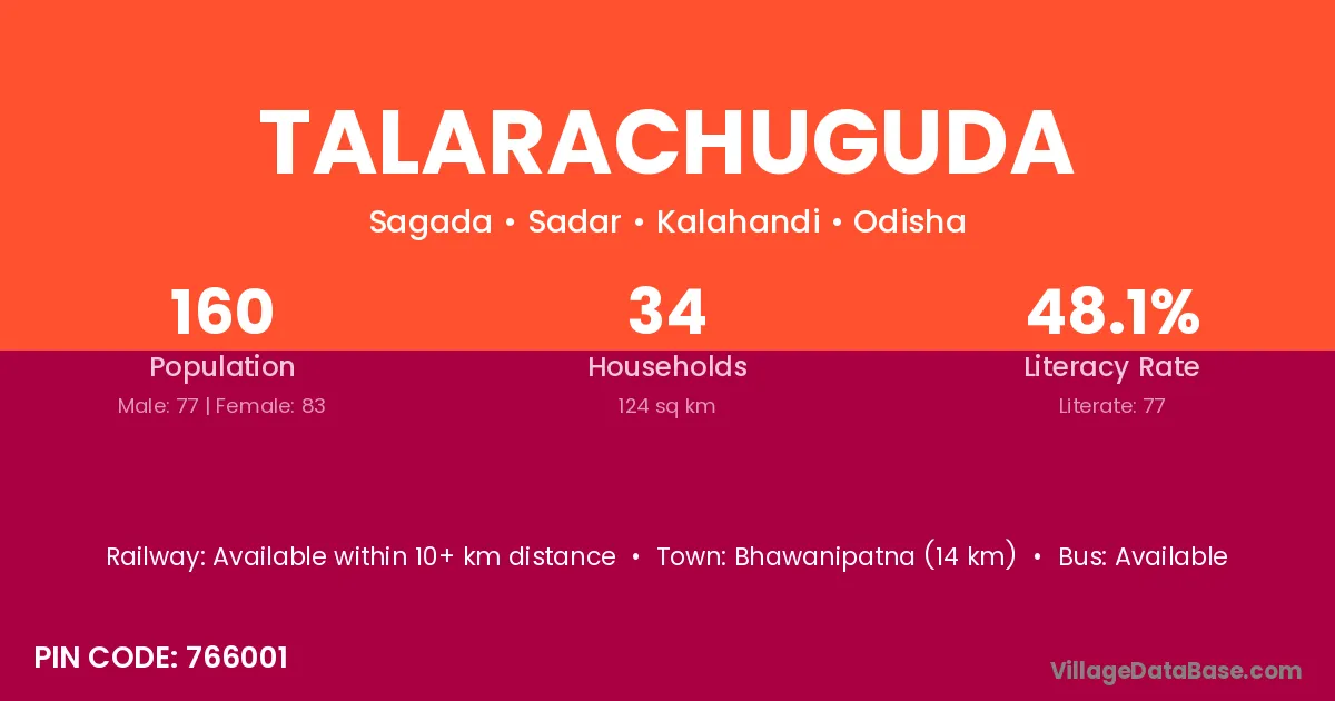 Bhawanipatna (14 km) is the nearest town to Talarachuguda village for major economic activities and is located approximately 14 km away.