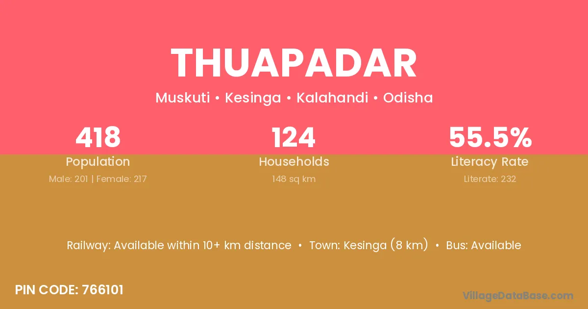 Bhawanipatna (13 km) is the nearest town to Thuapadar village for major economic activities and is located approximately 13 km away.
