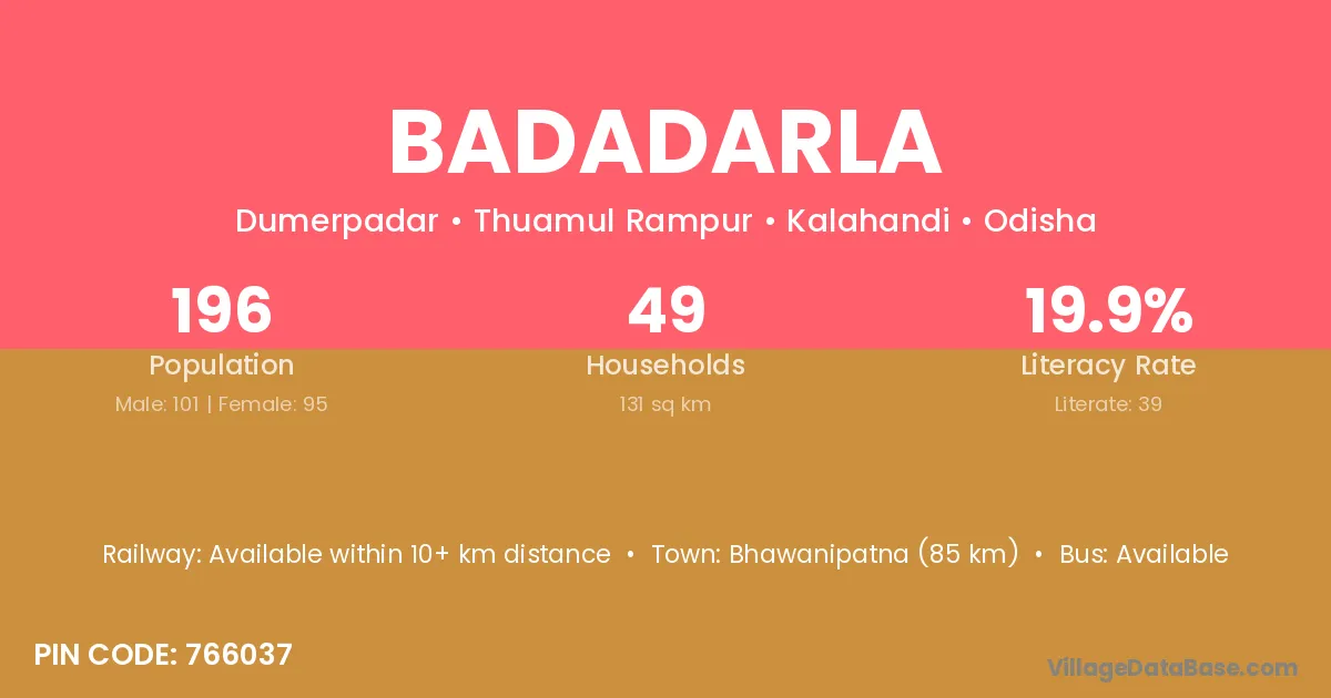 Bhawanipatna (85 km) is the nearest town to Badadarla village for major economic activities and is located approximately 85 km away.