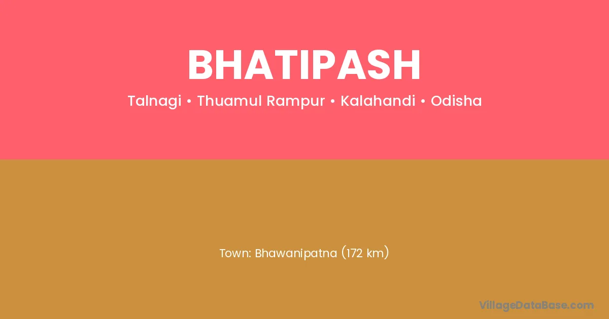 Bhawanipatna (172 km) is the nearest town to Bhatipash village for major economic activities and is located approximately 172 km away.