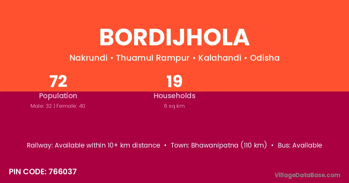 Bhawanipatna (110 km) is the nearest town to Bordijhola village for major economic activities and is located approximately 110 km away.