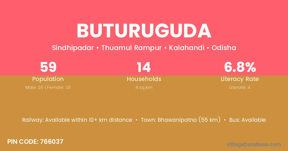 Bhawanipatna (55 km) is the nearest town to Buturuguda village for major economic activities and is located approximately 55 km away.