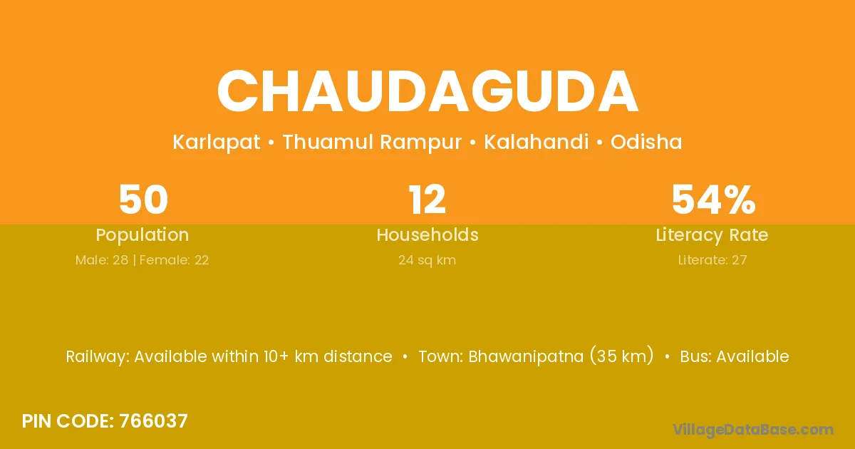 Bhawanipatna (35 km) is the nearest town to Chaudaguda village for major economic activities and is located approximately 35 km away.