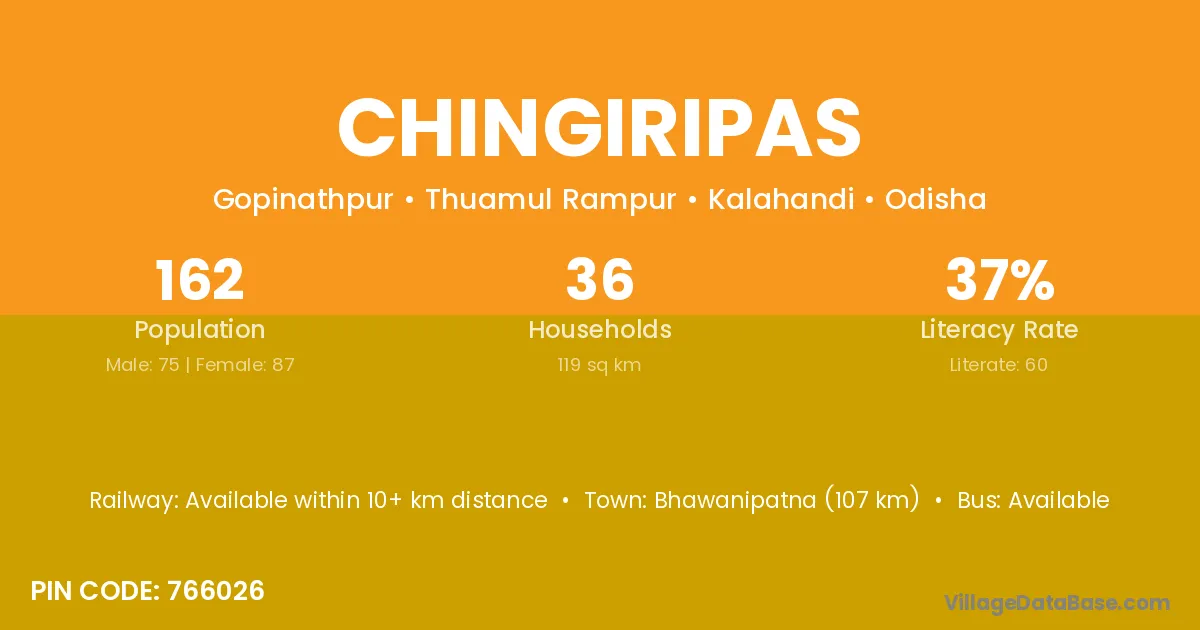 Bhawanipatna (107 km) is the nearest town to Chingiripas village for major economic activities and is located approximately 107 km away.