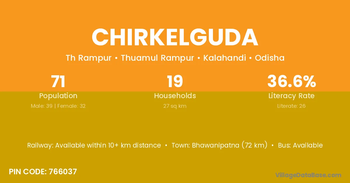 Bhawanipatna (72 km) is the nearest town to Chirkelguda village for major economic activities and is located approximately 72 km away.