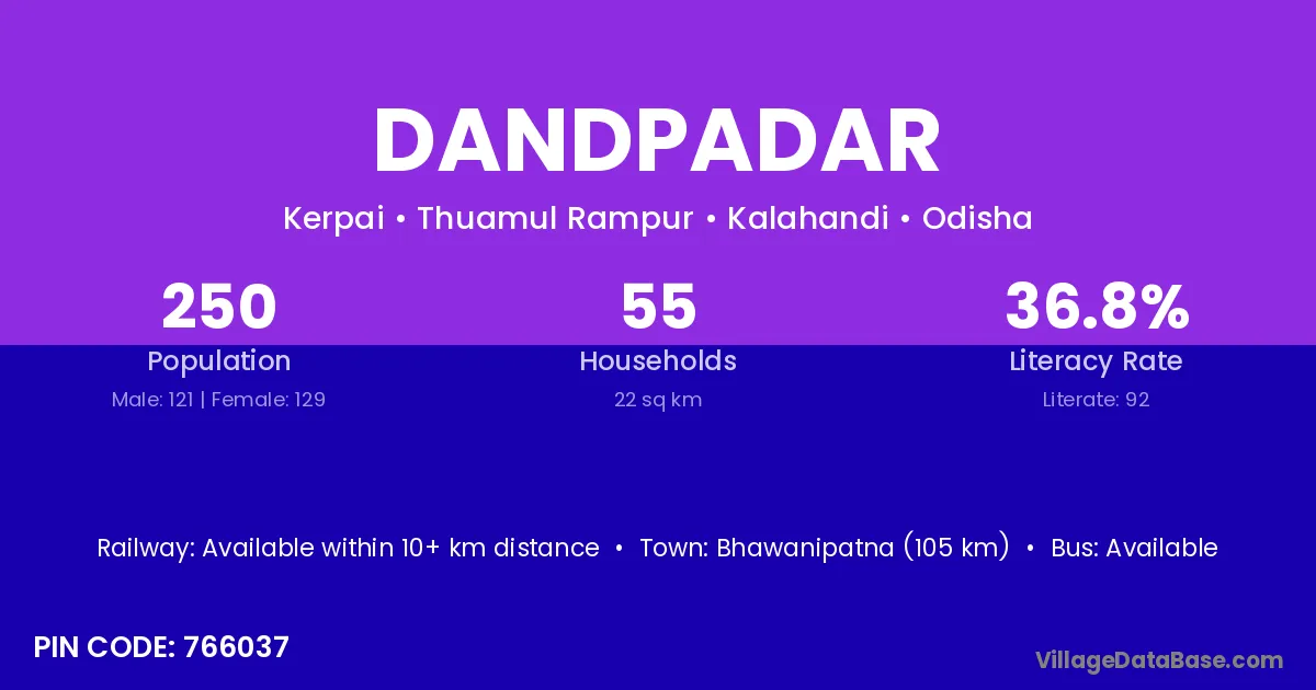 Bhawanipatna (105 km) is the nearest town to Dandpadar village for major economic activities and is located approximately 105 km away.