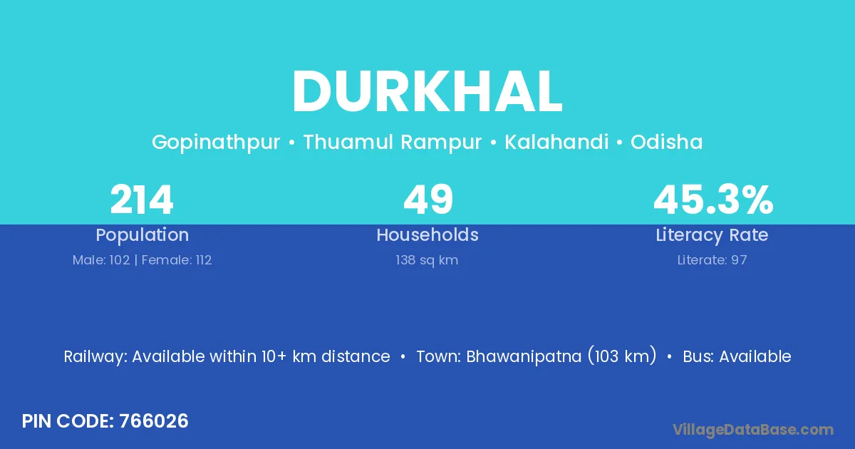 Bhawanipatna (103 km) is the nearest town to Durkhal village for major economic activities and is located approximately 103 km away.