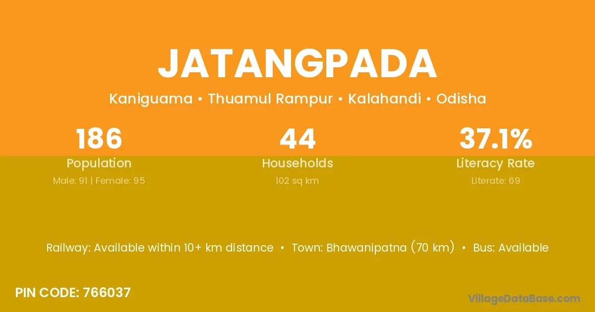 Bhawanipatna (70 km) is the nearest town to Jatangpada village for major economic activities and is located approximately 70 km away.