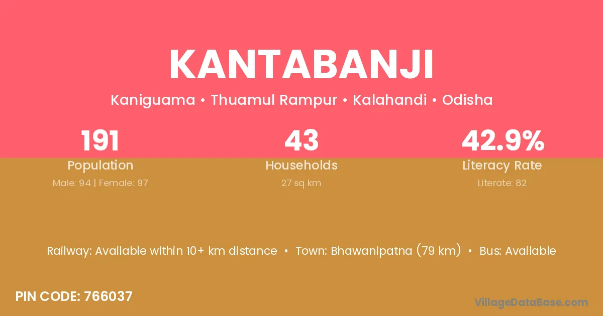 Kantabanji village has a total population of 191 people, of which 94 are males and 97 are females.