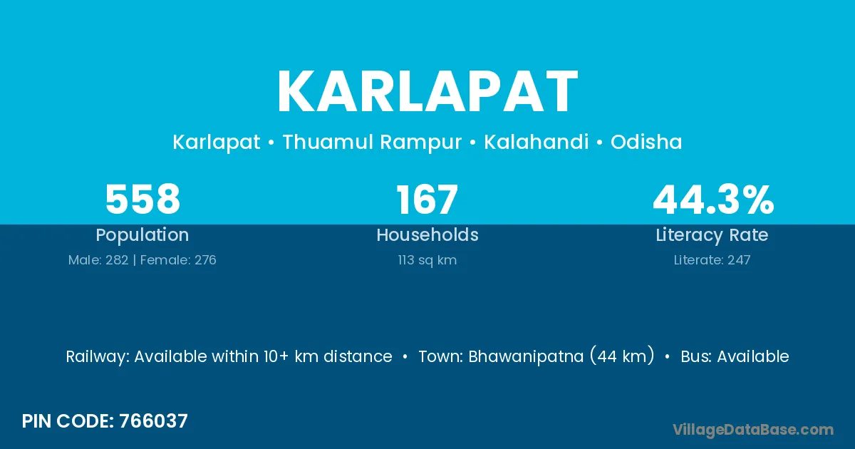 Bhawanipatna (44 km) is the nearest town to Karlapat village for major economic activities and is located approximately 44 km away.