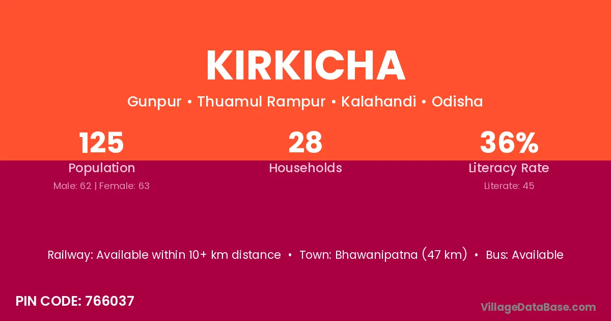 Bhawanipatna (47 km) is the nearest town to Kirkicha village for major economic activities and is located approximately 47 km away.