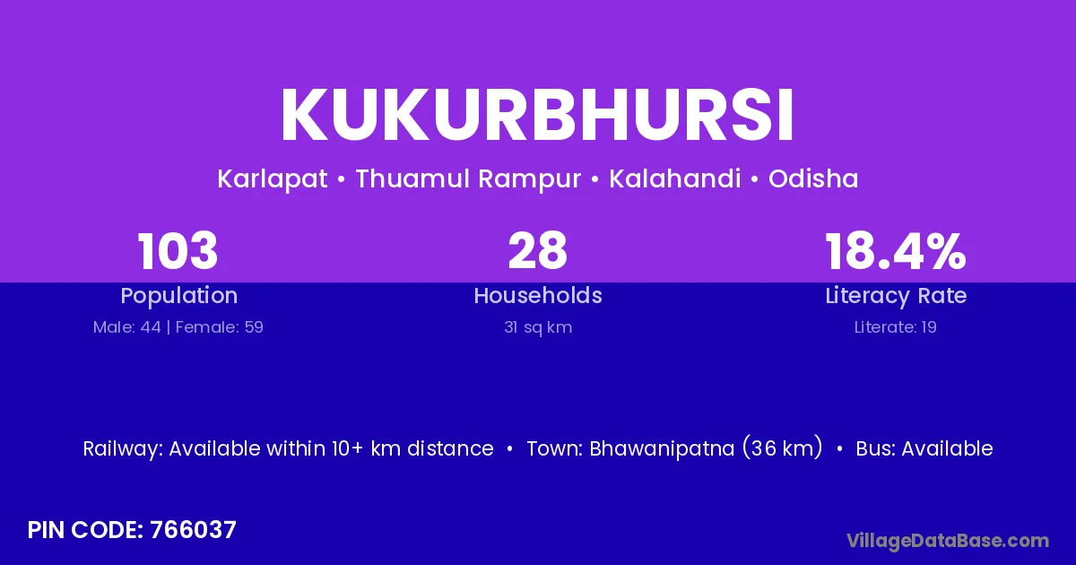 Bhawanipatna (36 km) is the nearest town to Kukurbhursi village for major economic activities and is located approximately 36 km away.