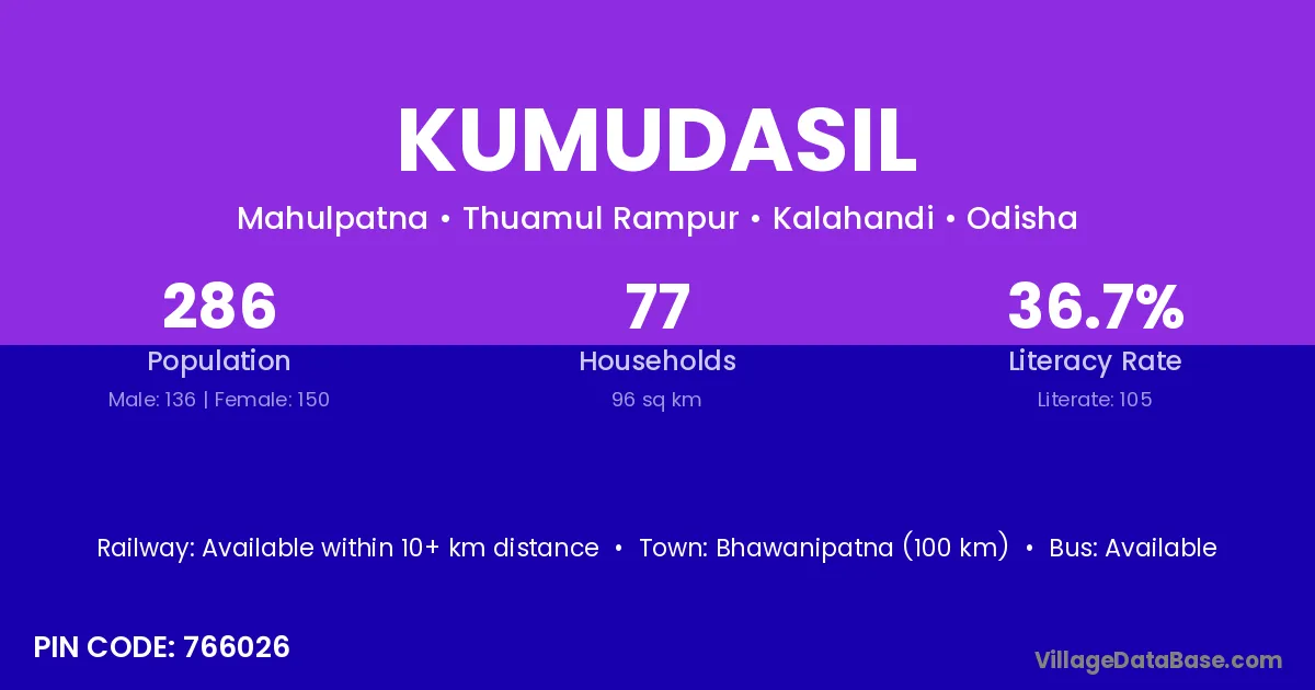 Bhawanipatna (100 km) is the nearest town to Kumudasil village for major economic activities and is located approximately 100 km away.