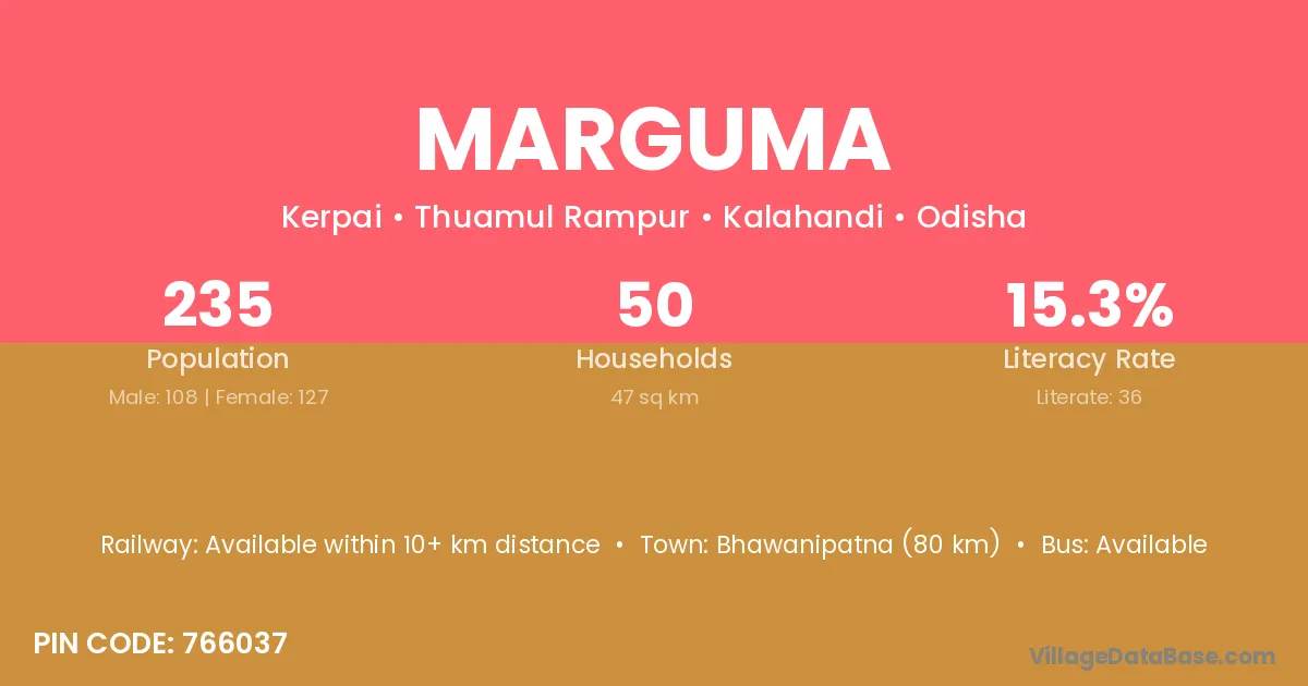 Bhawanipatna (80 km) is the nearest town to Marguma village for major economic activities and is located approximately 80 km away.