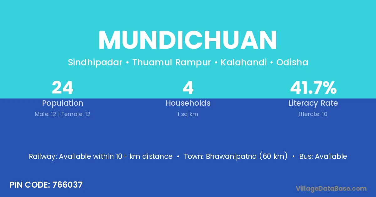 Bhawanipatna (60 km) is the nearest town to Mundichuan village for major economic activities and is located approximately 60 km away.
