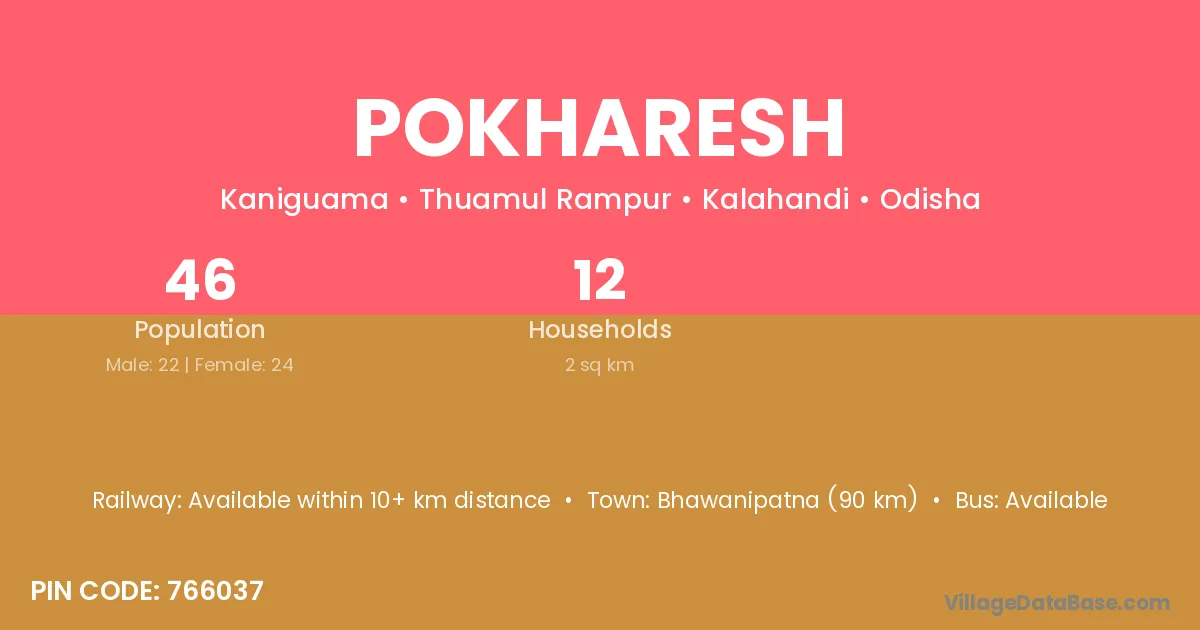 Bhawanipatna (90 km) is the nearest town to Pokharesh village for major economic activities and is located approximately 90 km away.