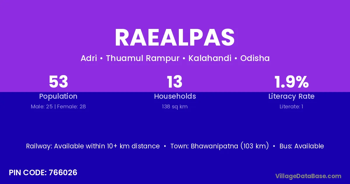 Bhawanipatna (103 km) is the nearest town to Raealpas village for major economic activities and is located approximately 103 km away.