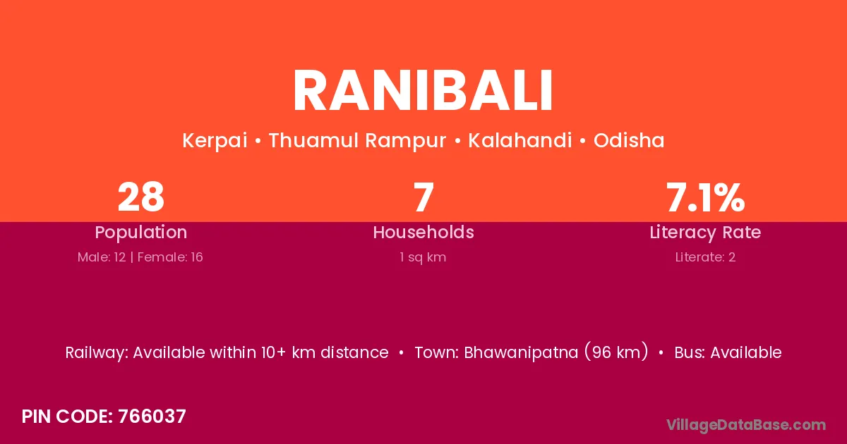 Bhawanipatna (96 km) is the nearest town to Ranibali village for major economic activities and is located approximately 96 km away.
