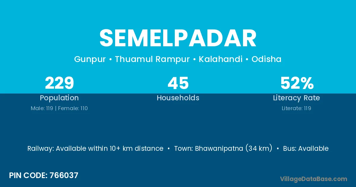 Bhawanipatna (34 km) is the nearest town to Semelpadar village for major economic activities and is located approximately 34 km away.