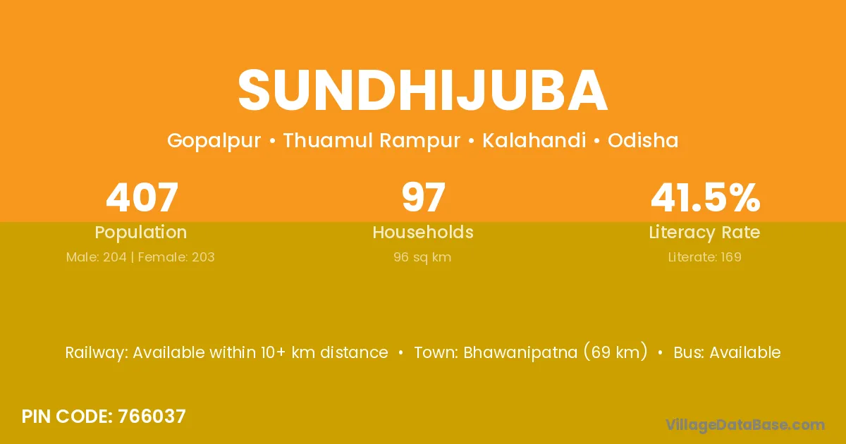 Bhawanipatna (69 km) is the nearest town to Sundhijuba village for major economic activities and is located approximately 69 km away.
