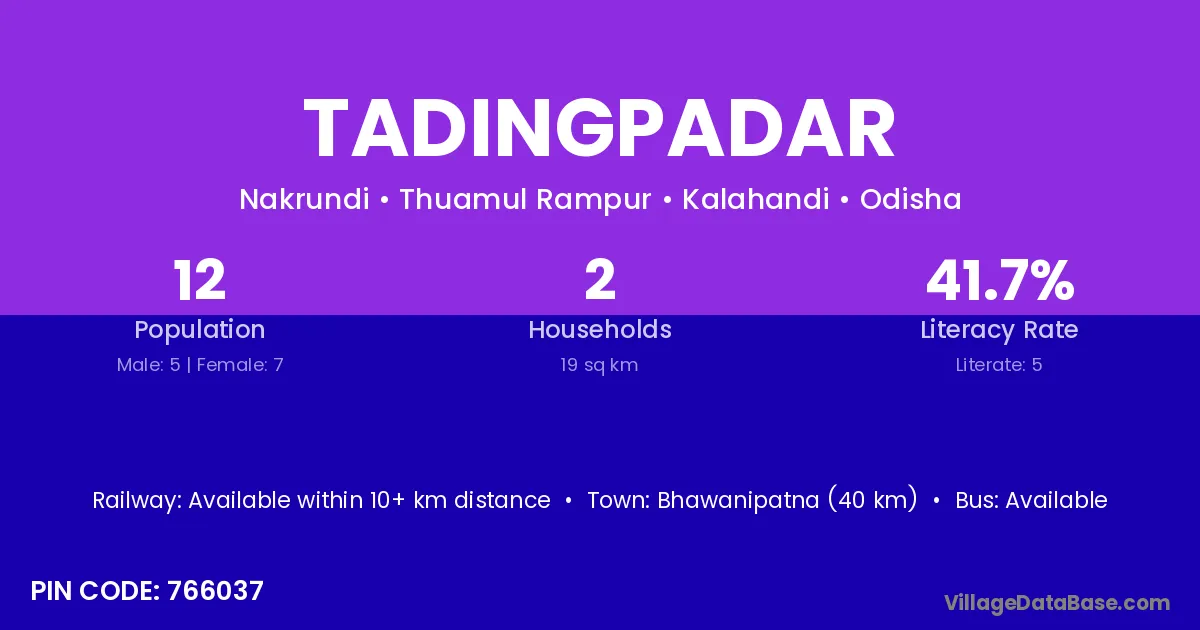 Bhawanipatna (40 km) is the nearest town to Tadingpadar village for major economic activities and is located approximately 40 km away.