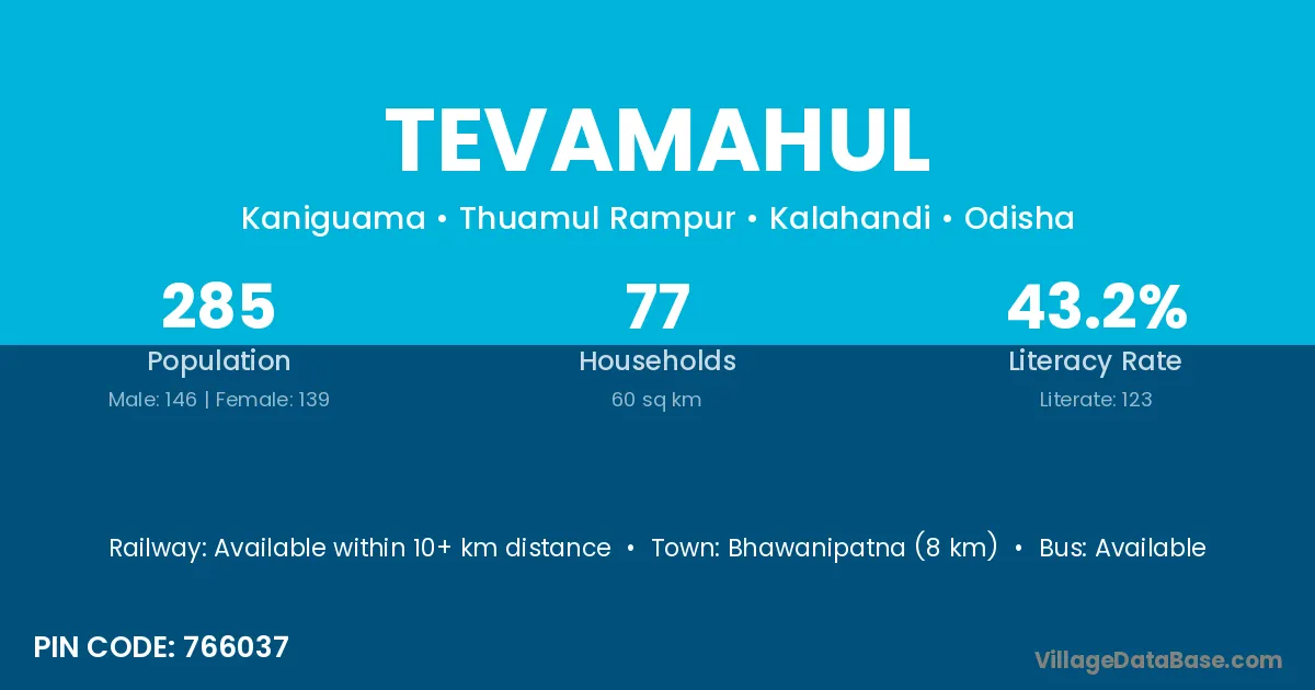 Bhawanipatna (8 km) is the nearest town to Tevamahul village for major economic activities and is located approximately 8 km away.