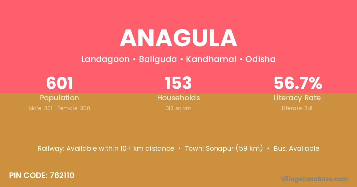 Anagula village has a total population of 601 people, of which 301 are males and 300 are females.