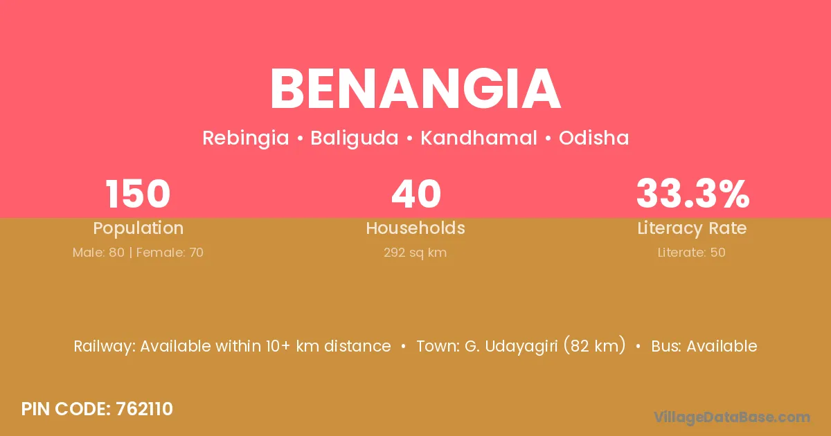 G. Udayagiri (82 km) is the nearest town to Benangia village for major economic activities and is located approximately 82 km away.