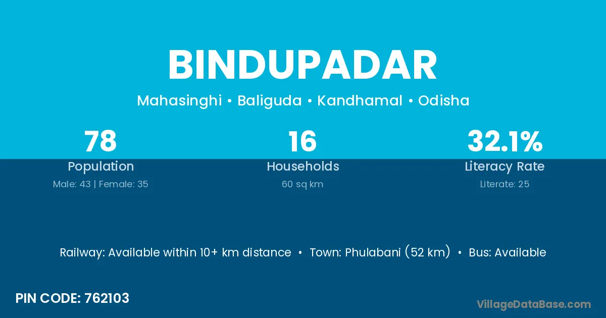 Phulabani (52 km) is the nearest town to Bindupadar village for major economic activities and is located approximately 52 km away.