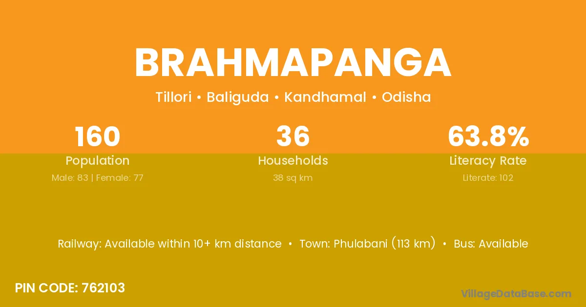 Phulabani (113 km) is the nearest town to Brahmapanga village for major economic activities and is located approximately 113 km away.
