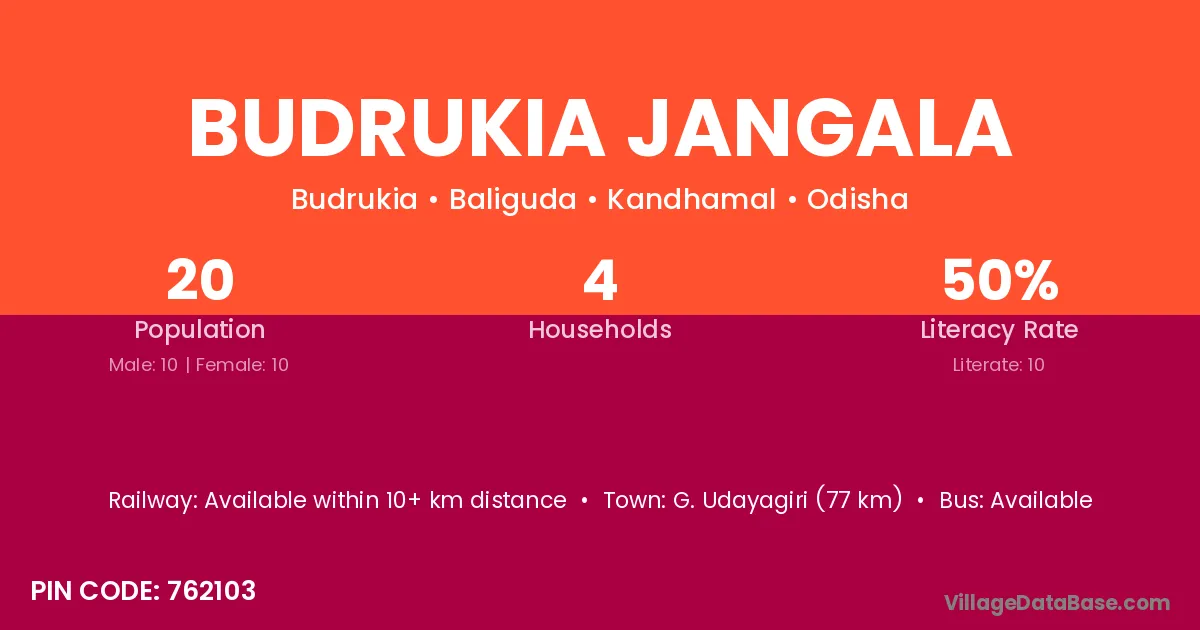 Budrukia Jangala village has a total population of 20 people, of which 10 are males and 10 are females.