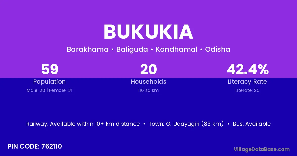 G. Udayagiri (83 km) is the nearest town to Bukukia village for major economic activities and is located approximately 83 km away.