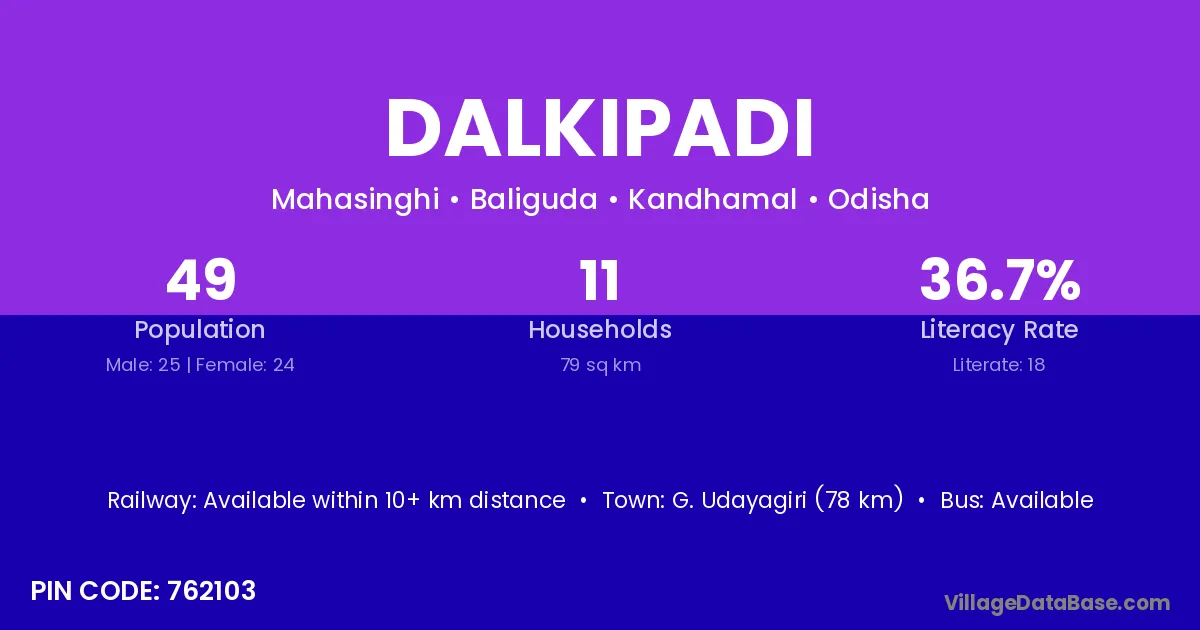Dalkipadi village has a total population of 49 people, of which 25 are males and 24 are females.