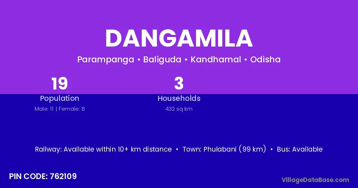 Phulabani (99 km) is the nearest town to Dangamila village for major economic activities and is located approximately 99 km away.